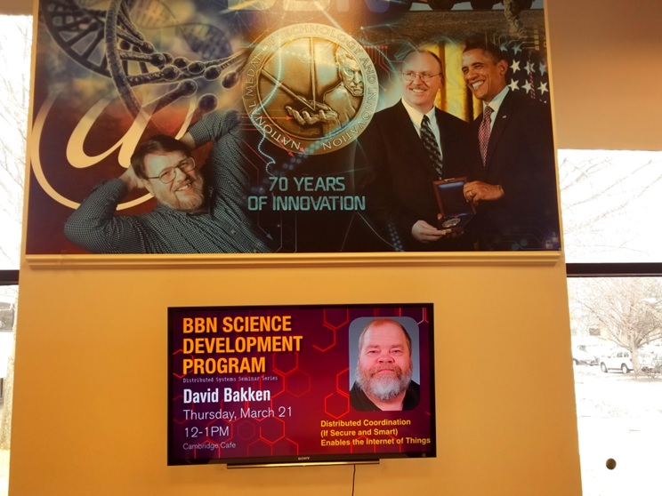 · Seminar announcement at BBN in 2019 for my seminar, Distributed Coordination (IF Secure and Smart) Enables the Internet of Things. The guy on the left is Ray Tomlinson, who wrote the first inter-computer email program, decided on the ‘@’ convention for email addresses, and sent the first email message in 1971–1972; his office was just down the hall from mine. Then is Ed Campbell, who was my department manager at BBN and in this picture was then CEO of BBN. Finally there is some unknown skinny guy from South Chicago who reportedly enjoys pickup hoops games. Below them is some ugly guy who probably broke the camera and caused people to lose their lunch when they saw this announcement monitor in the cafeteria; as of early 2025, This rogue researcher has somehow avoided tort claims for this vomitus.